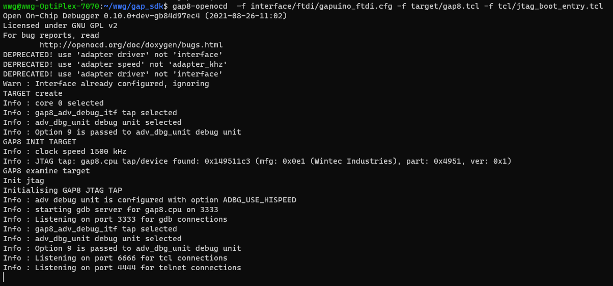 gap8-openocd -f interface/ftdi/gapuino_ftdi.cfg -f target/gap8.tcl -f tcl/jtag_boot_entry.tcl