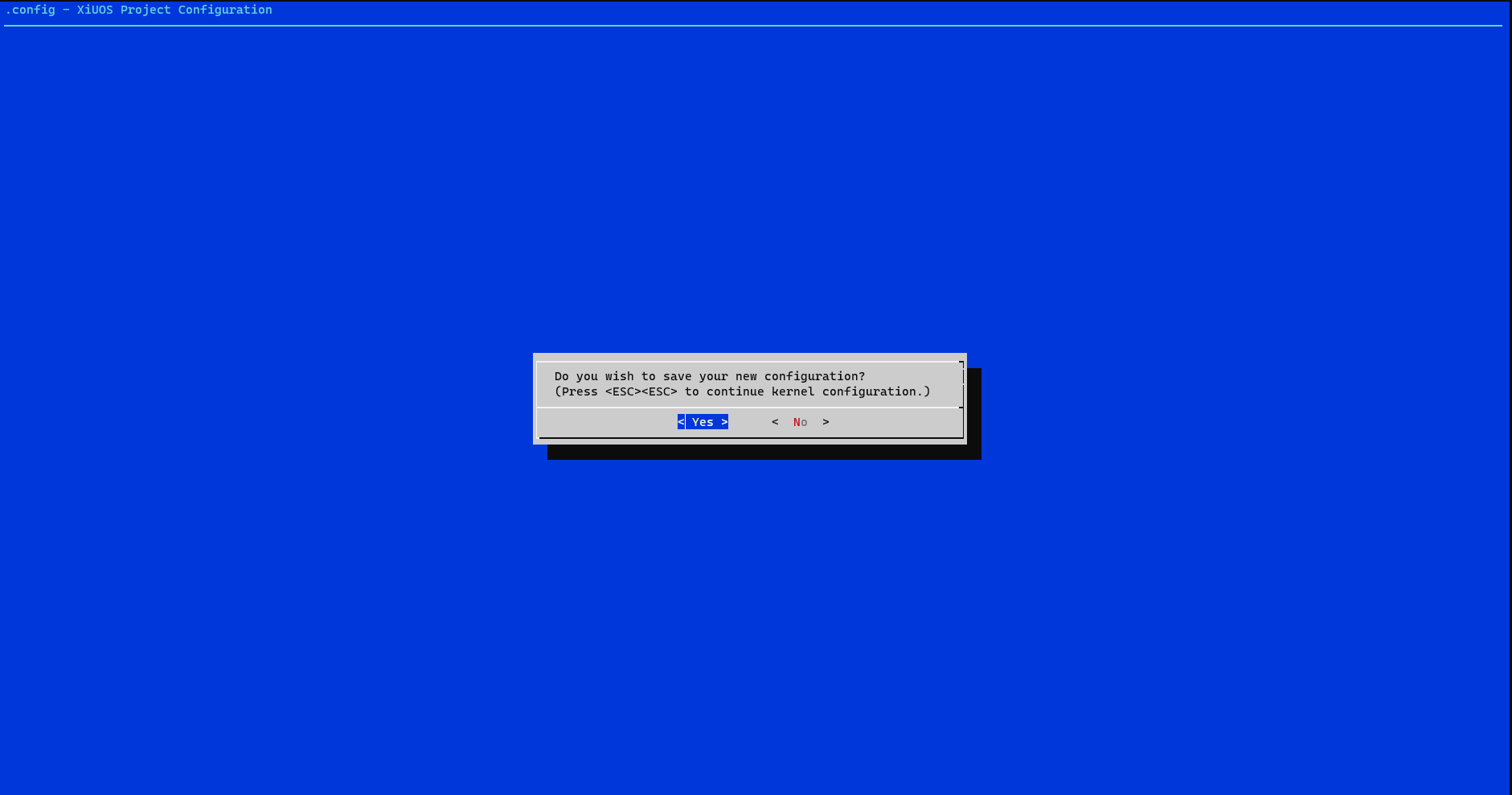 2.在menuconfig界面配置需要关闭和开启的功能,按回车键进入下级菜单,按Y键选中需要开启的功能,按N键选中需要关闭的功能,配置结束后保存并退出(本例旨在演示简单的输出例程,所以没有需要配置的选项,双击快捷键ESC退出配置)