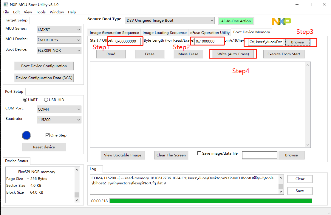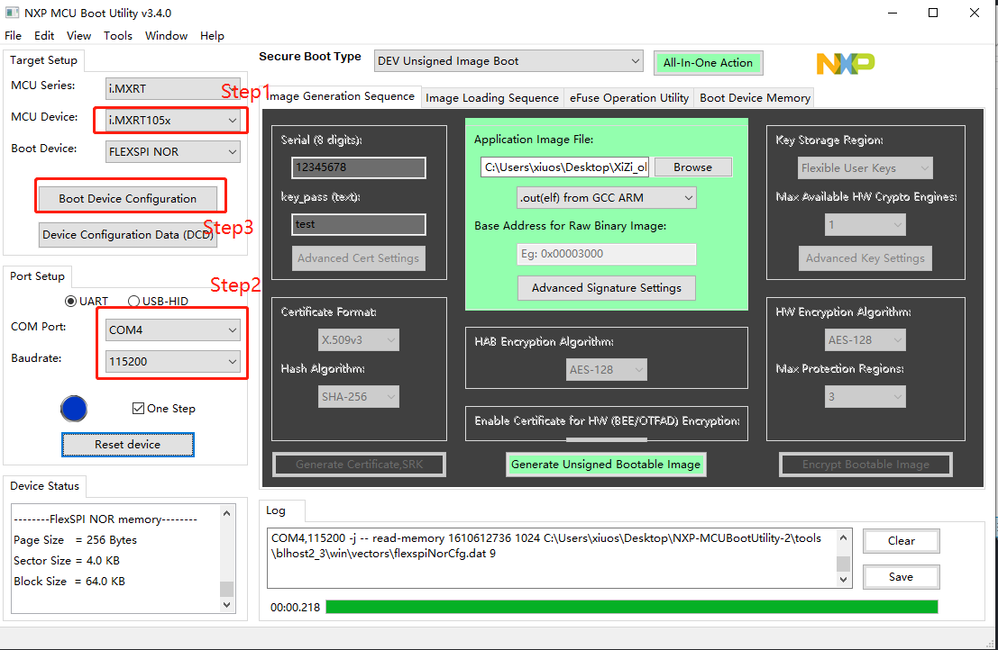 4、选择编译生成的XiZi-xidatong-arm32.elf或bin文件路径,按照图示步骤,将文件烧写至Flash中(link.lds中已构造Flash Bootable image,如有修改Flash相关配置需求,可修改/xip目录内相关文件,无需NXPBootUtility再次构造),若烧写无误,则下列绿色进度条会执行到底。如下图所示: