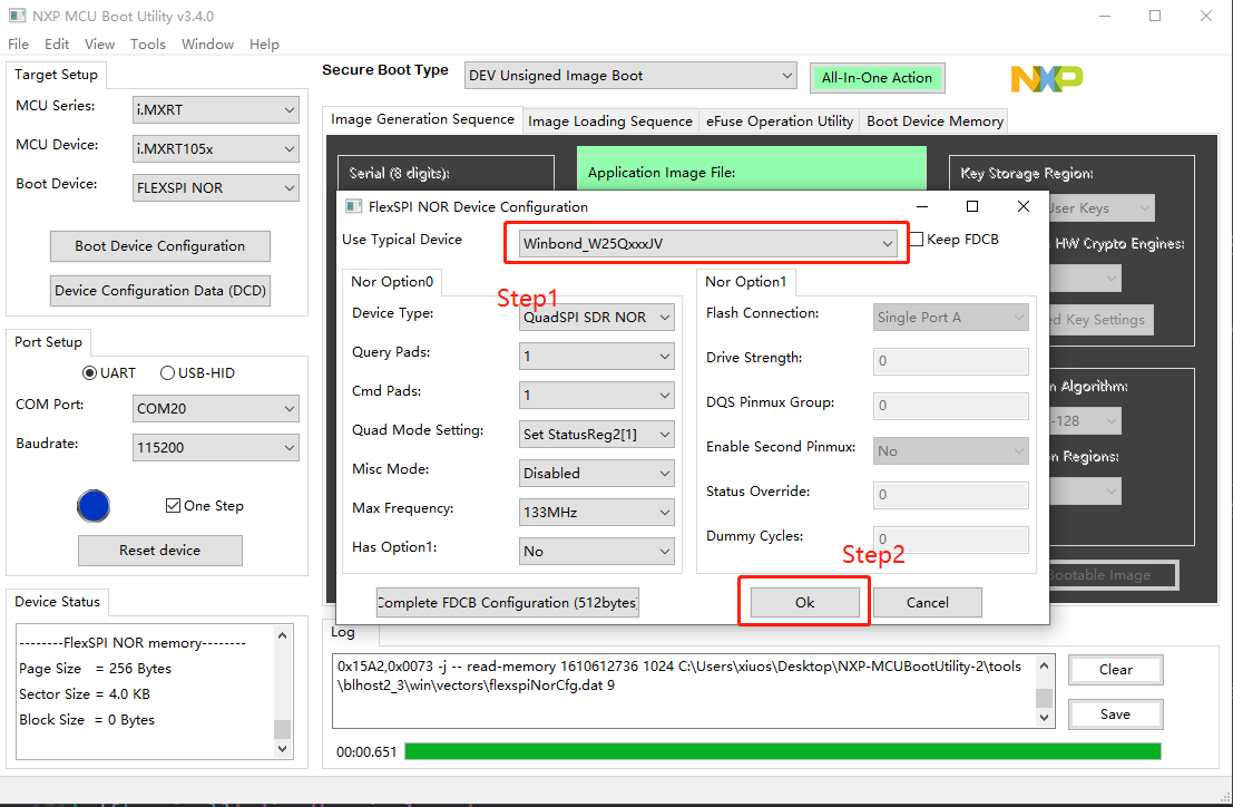 3、同时需要匹配xidatong-arm32开发板所使用的Flash型号,点击Boot Device Configuration,在Use Typical Device中选择Winbond_W25QxxxJV,然后点击ok。如下图所示: