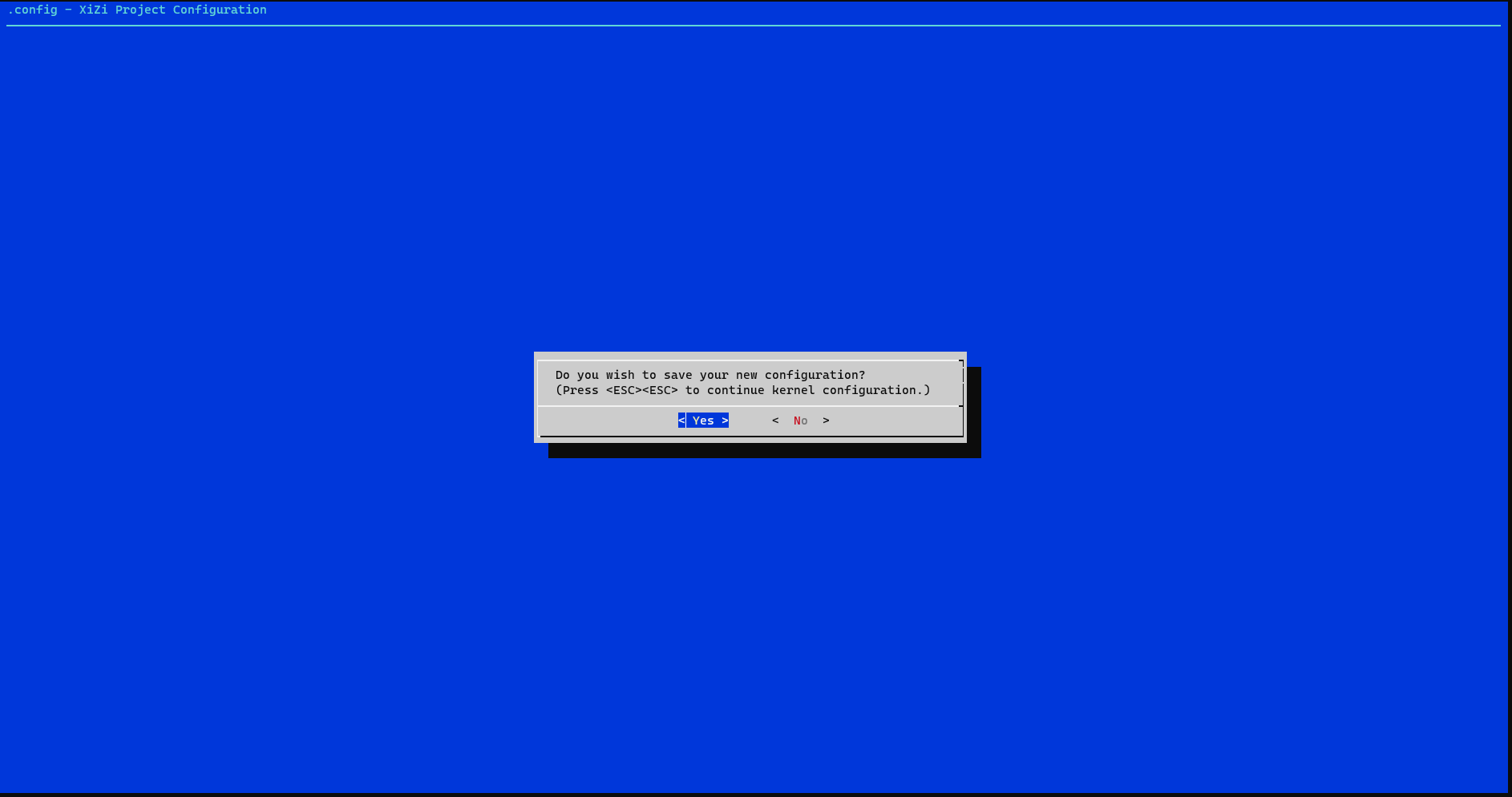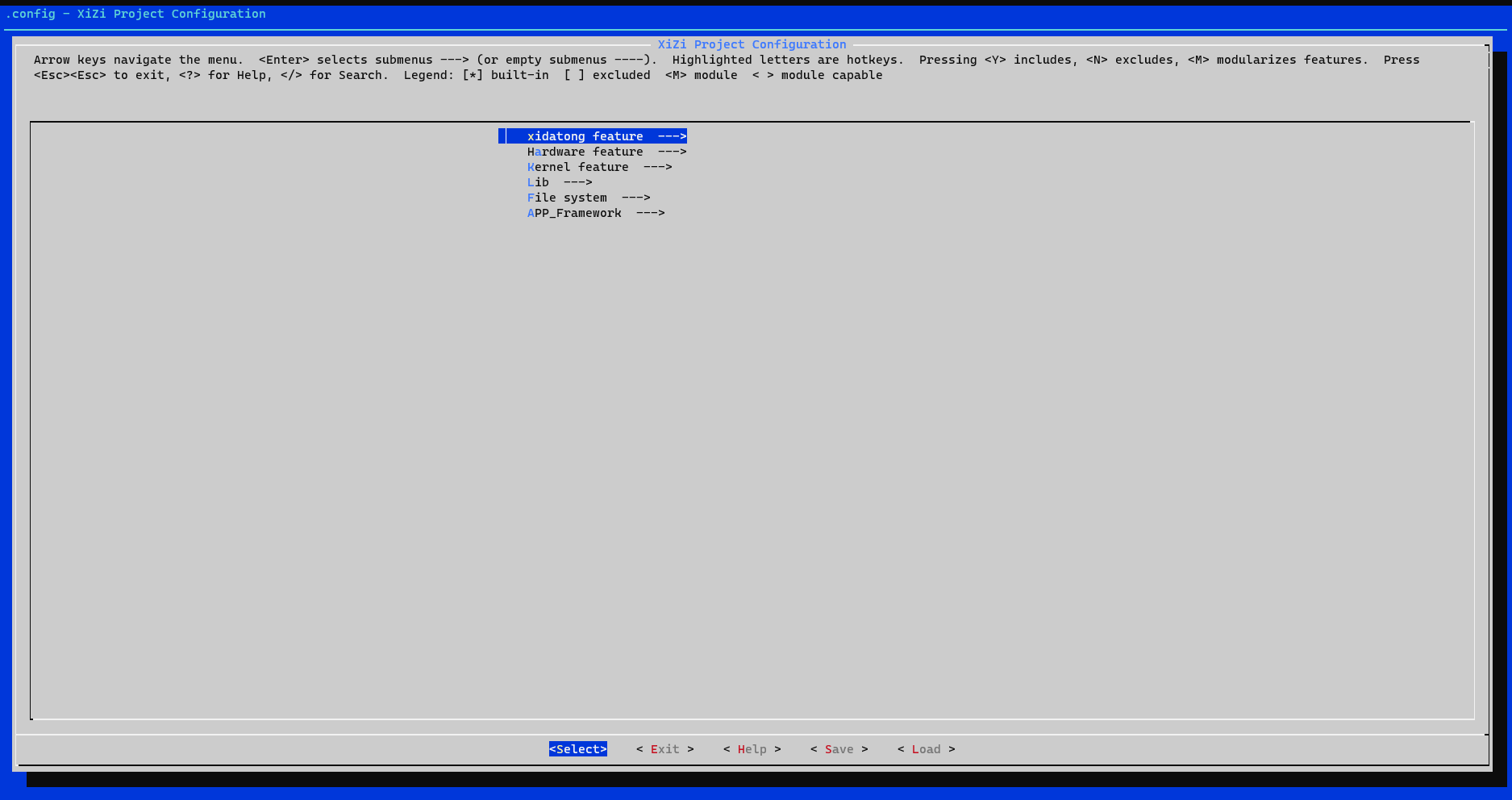 2.在menuconfig界面配置需要关闭和开启的功能,按回车键进入下级菜单,按Y键选中需要开启的功能,按N键选中需要关闭的功能,配置结束后保存并退出(本例旨在演示简单的输出例程,所以没有需要配置的选项,双击快捷键ESC退出配置)