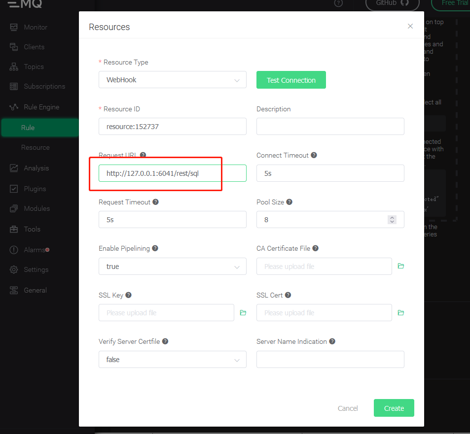 Select "WebHook" and fill in the request URL as the address and port of the server running taosAdapter (default is 6041). Leave the other properties at their default values.