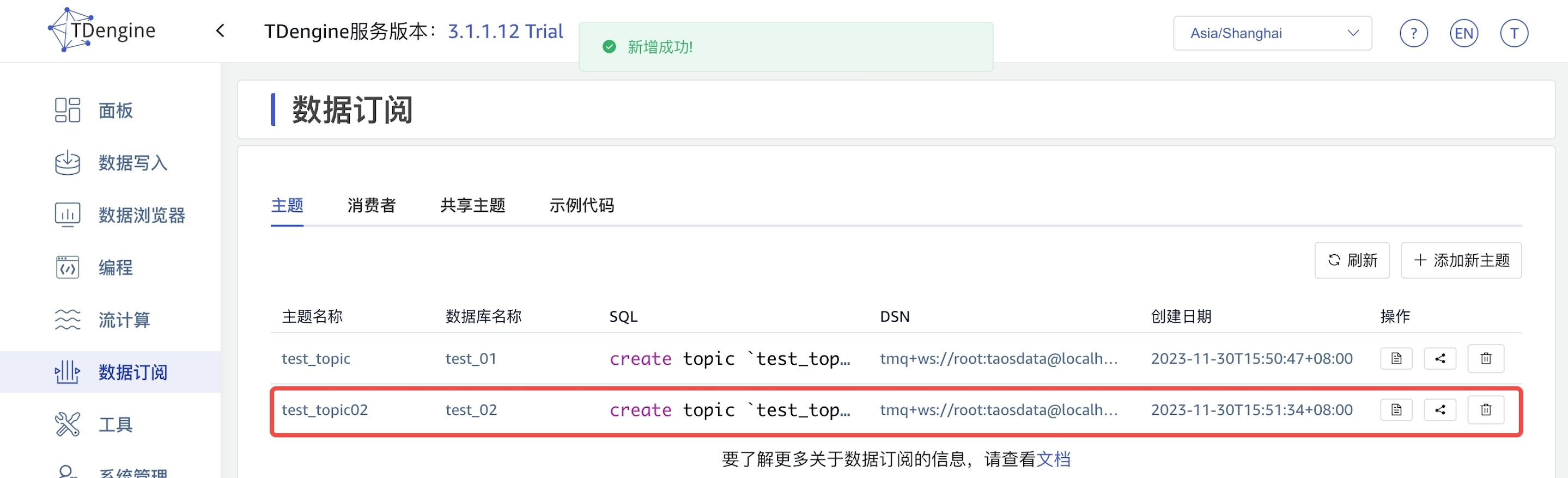 通过 Explorer, 您可以轻松地完成对数据订阅的管理,从而更好地利用 TDengine 提供的数据订阅能力。 点击左侧导航栏中的“数据订阅”,即可跳转至数据订阅配置管理页面。 您可以通过以下两种方式创建主题:使用向导和自定义 SQL 语句。通过自定义 SQL 创建主题时,您需要了解 TDengine 提供的数据订阅 SQL 语句的语法,并保证其正确性。