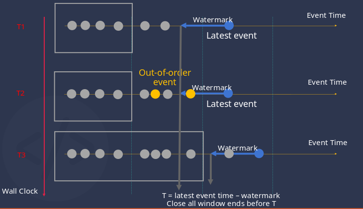 横轴上的数据点表示已经收到的数据,其中蓝色的点表示事件时间(即数据中的时间戳主键)最后的数据,该数据点减去定义的 watermark 时间,得到乱序容忍的上界 T。