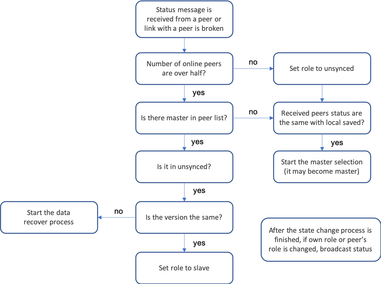 - 如果master不存在,则会检查自己保存的各虚拟节点的状态信息与从另一节点接收到的是否一致,如果一致,说明节点组里状态已经稳定一致,则会触发选举流程。如果不一致,说明状态还没趋于一致,即使master不存在,也不进行选主。由于要求状态信息一致才进行选举,每个虚拟节点根据同样的信息,会选出同一个虚拟节点做master,无需投票表决。