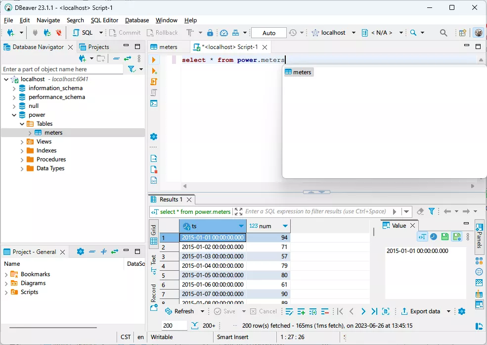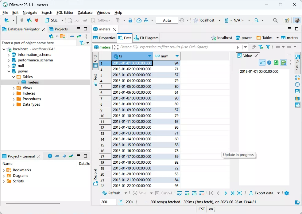 - Use DBeaver to select databases and tables and browse your data stored in TDengine.