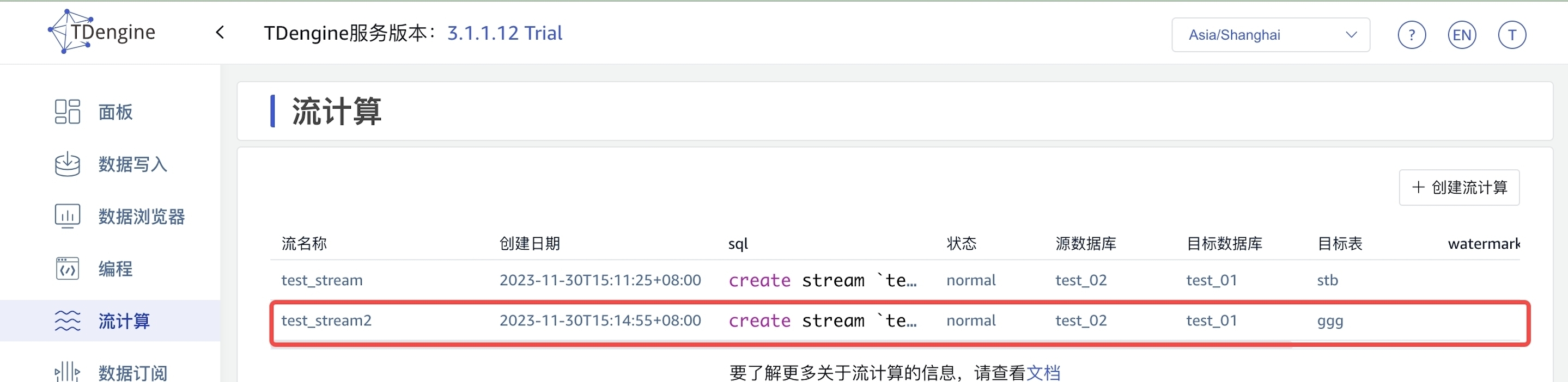 通过 Explorer 您可以轻松地完成对流的管理,从而更好地利用 TDengine 提供的流计算能力。 点击左侧导航栏中的“流计算”,即可跳转至流计算配置管理页面。 您可以通过以下两种方式创建流:流计算向导和自定义 SQL 语句。当前,通过流计算向导创建流时,暂不支持分组功能。通过自定义 SQL 创建流时,您需要了解 TDengine 提供的流计算 SQL 语句的语法,并保证其正确性。