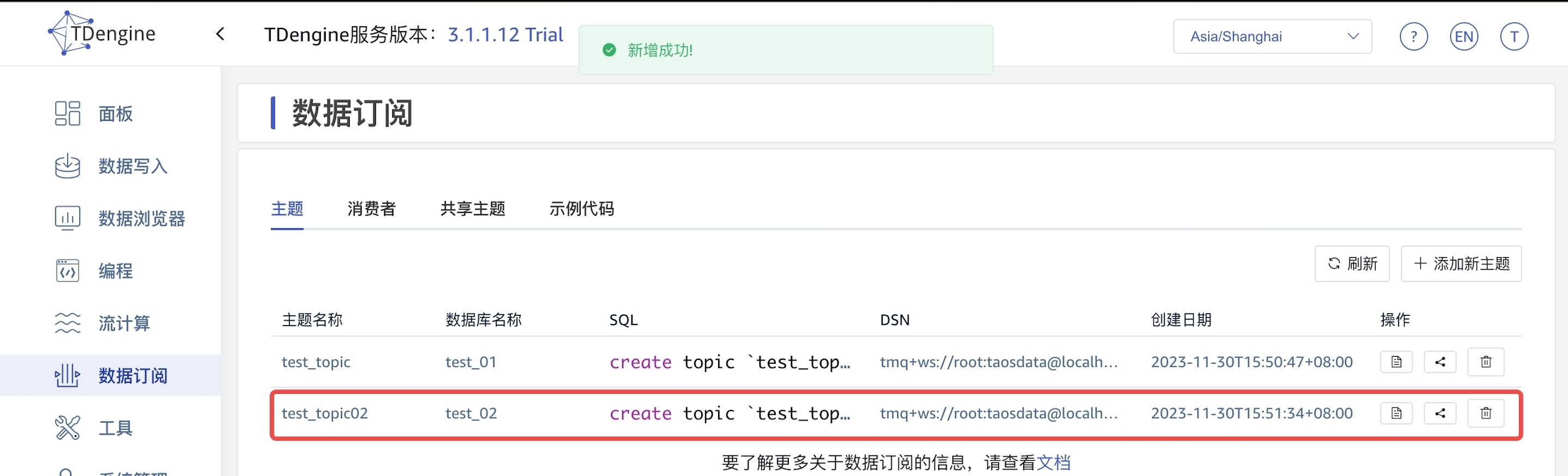 通过 Explorer 您可以轻松地完成对数据订阅的管理,从而更好地利用 TDengine 提供的数据订阅能力。 点击左侧导航栏中的“数据订阅”,即可跳转至数据订阅配置管理页面。 您可以通过以下两种方式创建主题:使用向导和自定义 SQL 语句。通过自定义 SQL 创建主题时,您需要了解 TDengine 提供的数据订阅 SQL 语句的语法,并保证其正确性。