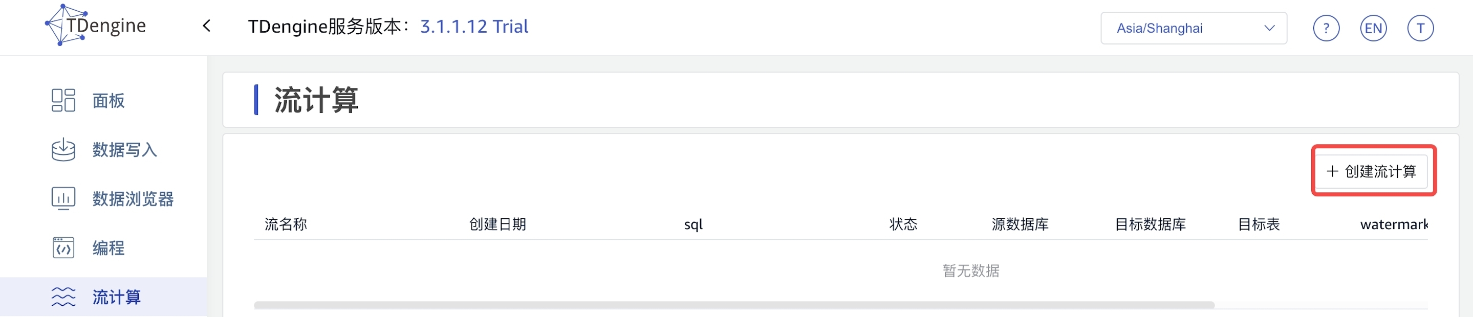 通过 Explorer, 您可以轻松地完成对流的管理,从而更好地利用 TDengine 提供的流计算能力。 点击左侧导航栏中的“流计算”,即可跳转至流计算配置管理页面。 您可以通过以下两种方式创建流:流计算向导和自定义 SQL 语句。当前,通过流计算向导创建流时,暂不支持分组功能。通过自定义 SQL 创建流时,您需要了解 TDengine 提供的流计算 SQL 语句的语法,并保证其正确性。