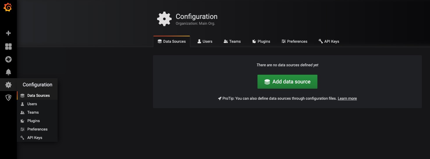 用户可以直接通过 localhost:3000 的网址,登录 Grafana 服务器(用户名/密码:admin/admin),通过左侧 Configuration -> Data Sources 可以添加数据源,如下图所示:
