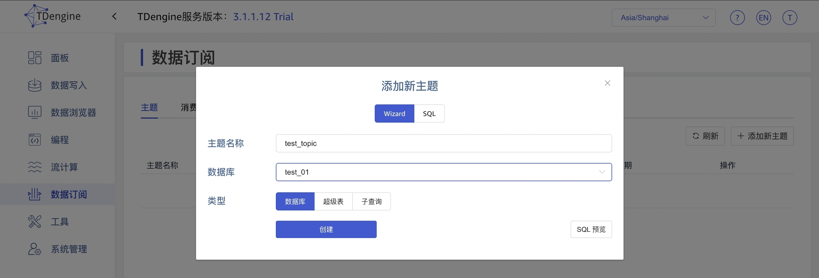 通过 Explorer 您可以轻松地完成对数据订阅的管理,从而更好地利用 TDengine 提供的数据订阅能力。 点击左侧导航栏中的“数据订阅”,即可跳转至数据订阅配置管理页面。 您可以通过以下两种方式创建主题:使用向导和自定义 SQL 语句。通过自定义 SQL 创建主题时,您需要了解 TDengine 提供的数据订阅 SQL 语句的语法,并保证其正确性。